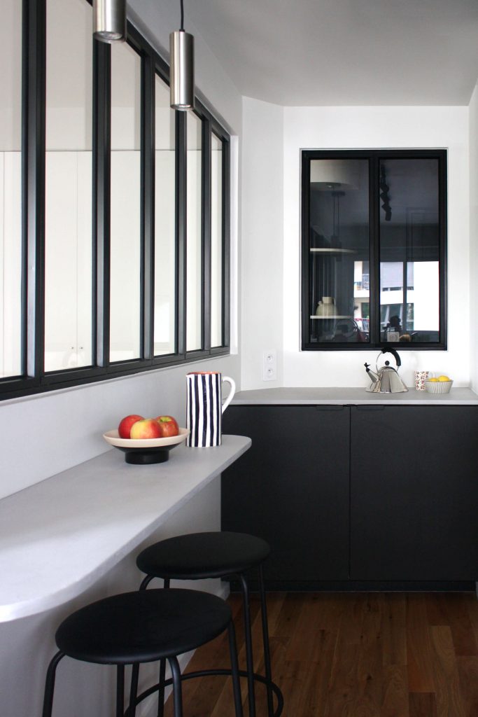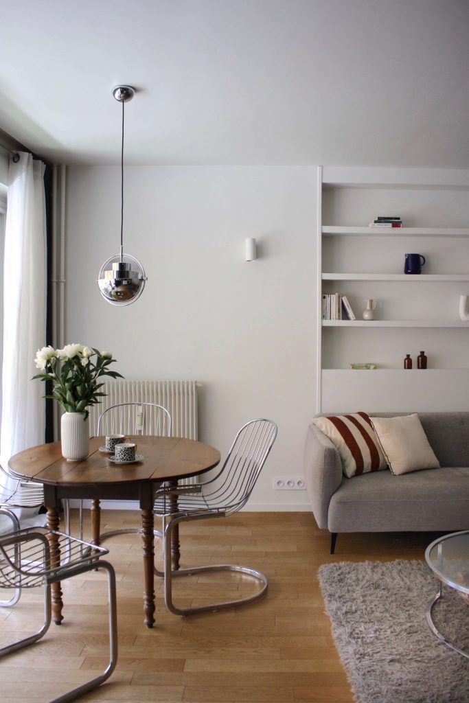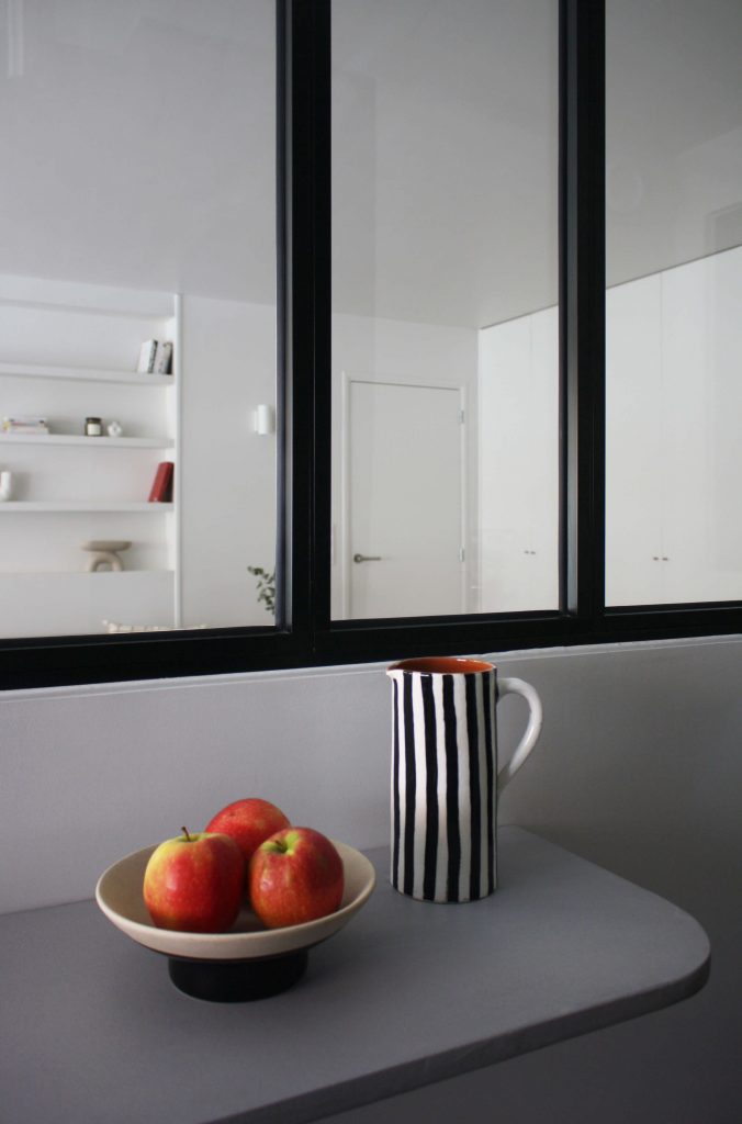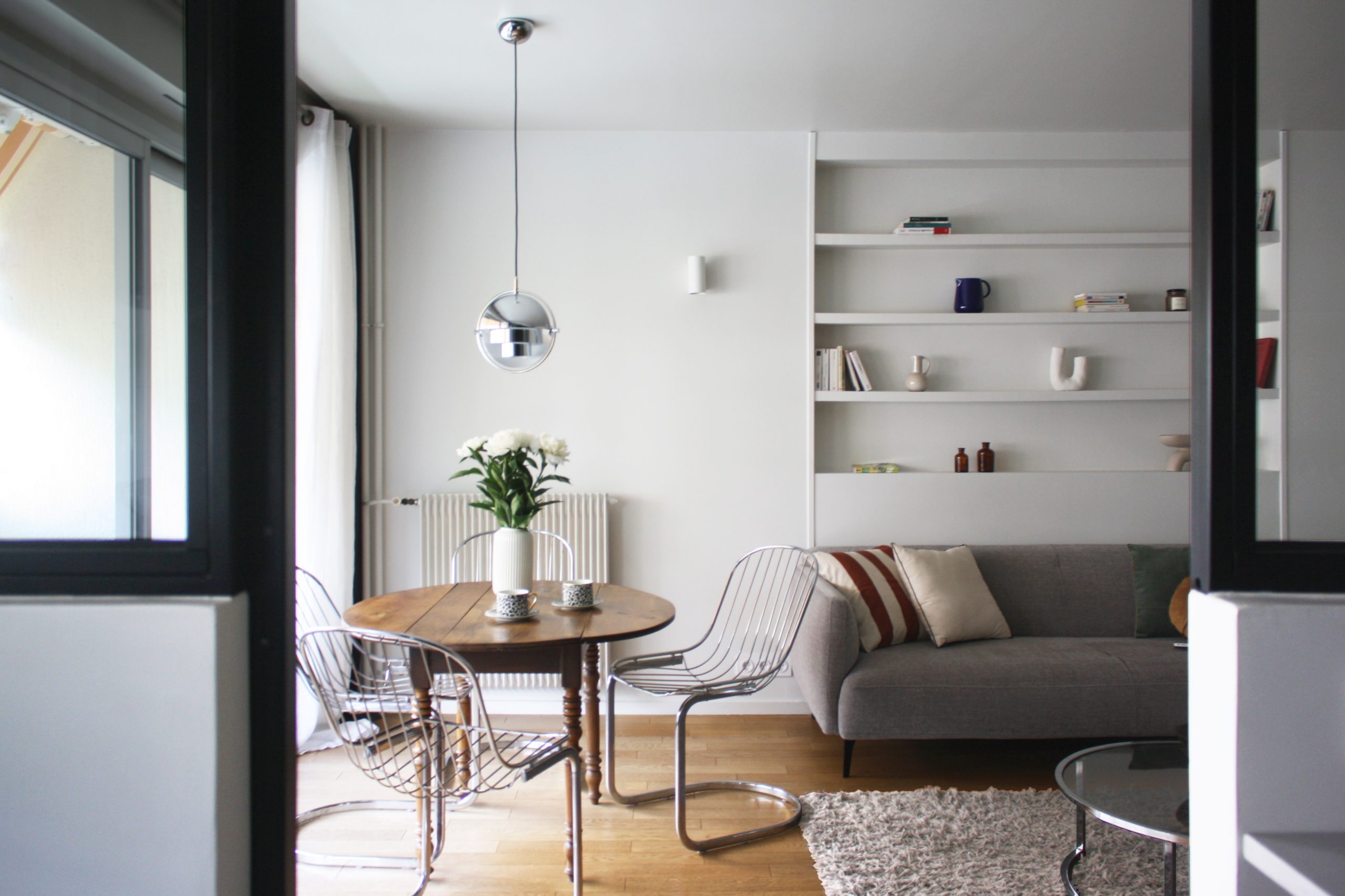 La pièce de vie principale et la cuisine de cet appartement des années 70 ont été totalement rénovées et optimisées. L’entrée était auparavant trop grande et cloisonnée par rapport au reste de l’appartement : elle a été conservée mais réduite à son minimum, permettant ainsi d’agrandir l’espace salon, de créer un coin repas, ainsi que de grands rangements. La cuisine a été ouverte sur le salon et entièrement vitrée. La lumière pénètre jusque dans l’entrée et l’appartement a gagné en espace et en fluidité