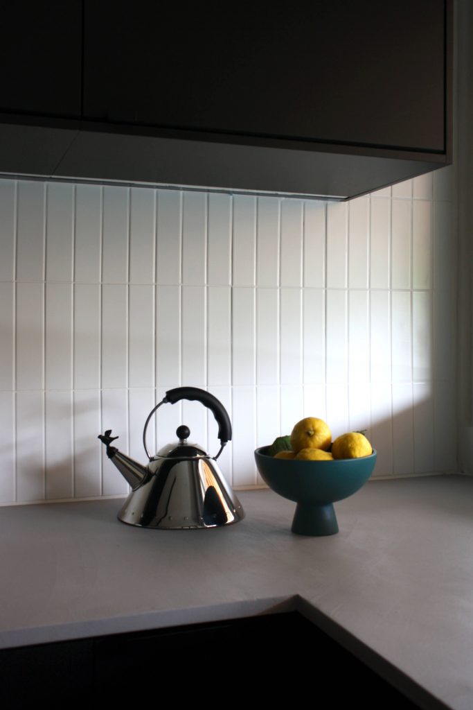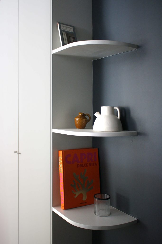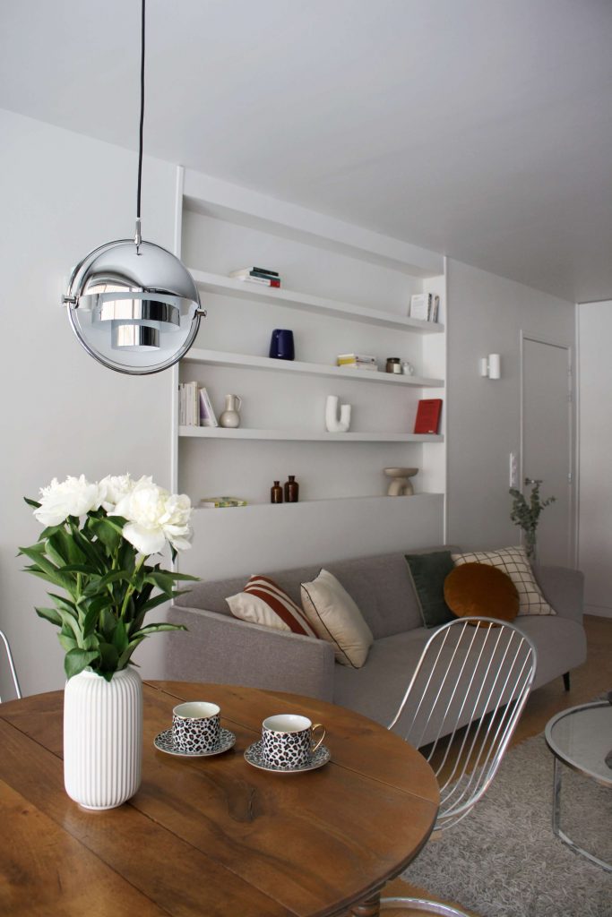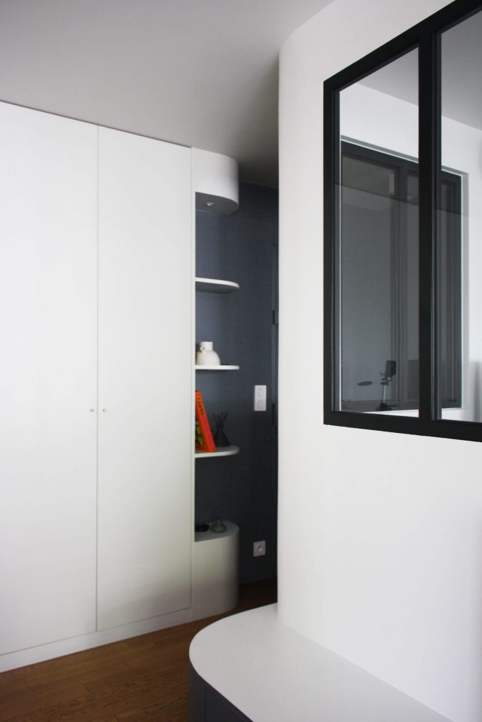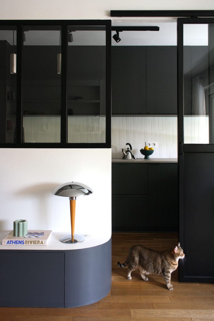 La pièce de vie principale et la cuisine de cet appartement des années 70 ont été totalement rénovées et optimisées. L’entrée était auparavant trop grande et cloisonnée par rapport au reste de l’appartement : elle a été conservée mais réduite à son minimum, permettant ainsi d’agrandir l’espace salon, de créer un coin repas, ainsi que de grands rangements. La cuisine a été ouverte sur le salon et entièrement vitrée. La lumière pénètre jusque dans l’entrée et l’appartement a gagné en espace et en fluidité